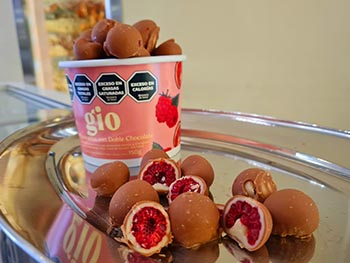 Frambuesas IQF cubiertas con un riquísimo baño de chocolate blanco y chocolate negro